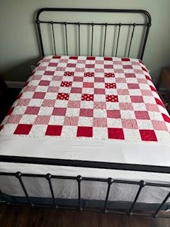 Simple, but striking, red and white fabrics of 5" square blocks are alternated in a pattern of the red fabrics radiating from the center of the quilt. Each "square" pattern of a red fabric blocks is followed by a larger "square" pattern of a different red fabric. The red fabrics include polka dots, zig zags, stripes, a floral and solid red. If you look closely, you'll see that the "white-on-white" fabrics have large polka dots, zig zag, and stripe designs. This 66" x 67" makes a great cover for a couch or bed. The batting lined quilt is backed with the white-on-white stripe fabric also used in the quilt top. Perfect for someone who loves red. You might also like two other red and white quilts on the site--Snowflakes Galore and Puzzle Pieces.